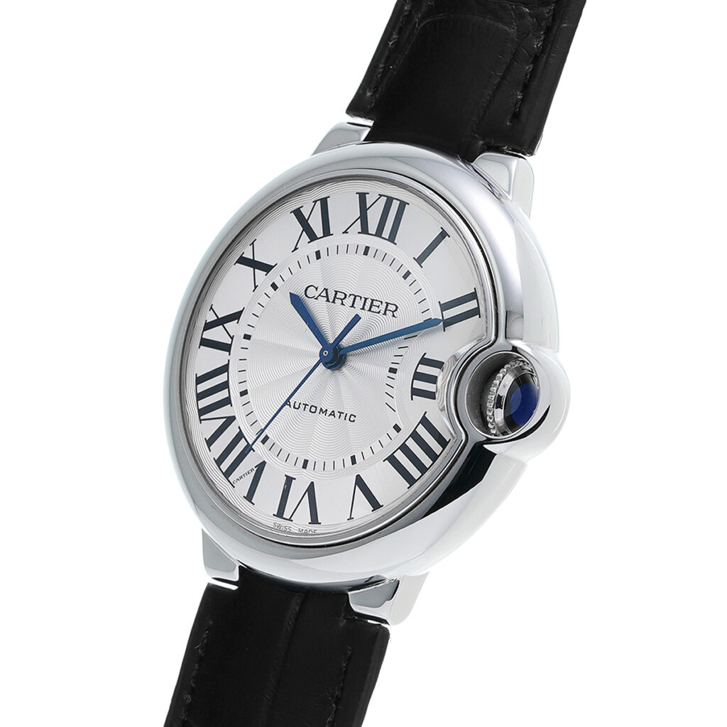 カルティエには珍しい円形ケースが特徴的なバロンブルーであるが、文字盤を見ればカルティエの腕時計であることが非常によくわかる。