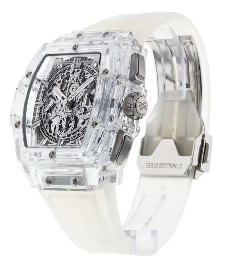 確かにサファイアクリスタルをケースに使用した腕時計は他では見ることがなく、ウブロの専売特許的にもなっていることを考えるとそうなのかもしれないが、すごく意外ではあった。