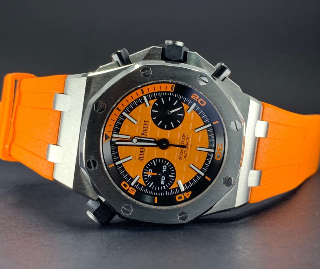 ロイヤルオークのオフショアにはクロノグラフモデルとダイバーズモデルが存在するが、僕もどちらかというとダイバーズ派で、こういった発色の良いオレンジのようなパーリーカラーを使用した腕時計はなんとも魅力的だ。