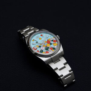 ロレックスの中でも異色の存在として語られるのが、この「セレブレーションモチーフ」のターコイズブルーである。41mmケースの堂々としたサイズ感に、カラフルなバブル状のモチーフが散りばめられた文字盤は、従来のロレックス像を軽やかに裏切る。堅実・保守的というイメージを覆し、「楽しむためのロレックス」を体現したモデルだ。視認性や実用性はあくまでベースとして確保されているが、それ以上に感情に訴えかけるデザインが特徴で、着ける人の気分を一段明るくする力を持つ。廃盤となったことで、その挑戦的な姿勢そのものが評価対象となり、今後は“時代を象徴するロレックス”として語られていく存在である。