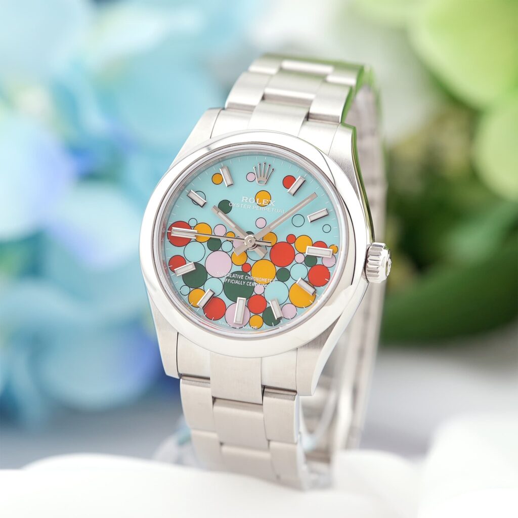 31mmのセレブレーションモチーフは、ロレックスの中でも特に軽やかな存在だ。サイズが小さい分、カラフルなモチーフが前に出すぎず、アクセサリー感覚で楽しめる仕上がりになっている。ジュエリーウォッチほど華美ではなく_toggleに, あくまで時計としての品格を保ちつつ、個性を表現できる点が魅力だ。実用時計としての堅牢性は他のオイスターパーペチュアルと同様で、気兼ねなく使えるのも大きい。セレブレーションモチーフの中では最も柔らかく、日常に寄り添うモデルであり、廃盤によって「さりげない遊び心を持つロレックス」として独自の立ち位置を築いていくだろう。