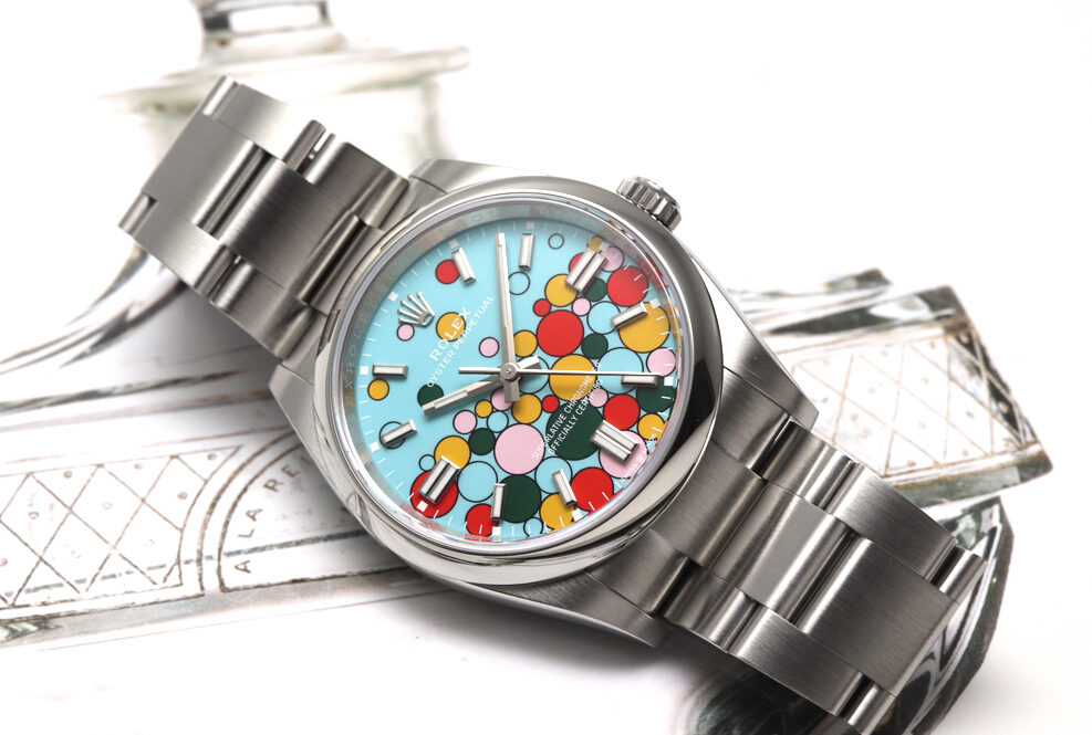 36mmというロレックスの伝統的サイズに、セレブレーションモチーフを組み合わせたこのモデルは、遊び心と品のバランスが非常に優れている。41mmほどのインパクトはないが、その分日常使いでの馴染みが良く、派手さが自然に腕元へ溶け込む。カラフルな文字盤でありながら、決して子どもっぽくならないのは、ケースやブレスレットの完成度が高いからだろう。クラシックなサイズ感に現代的な感性を注ぎ込んだこのモデルは、ロレックスが「変化を恐れていない」ことを静かに示していた。廃盤後は、最もバランスの取れたセレブレーションモデルとして評価が定まっていく可能性が高い。