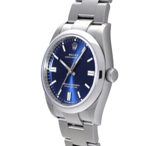31mmサイズのブルーバーインデックスは、控えめでありながら確かな存在感を放つ。ケースサイズが小さい分、ブルーの色味は柔らかく感じられ、上品さが際立つ仕上がりだ。バーインデックスによる視認性の良さと、シンプルなデザインが相まって、時計としての実用性も高い。アクセサリー感覚で着けられる一方、オイスターパーペチュアルらしい堅牢さは健在で、日常使いに一切の不安がない。主張しすぎず、それでいて確かな品質を感じさせるこのモデルは、長く付き合うほど信頼が深まるタイプの一本である。