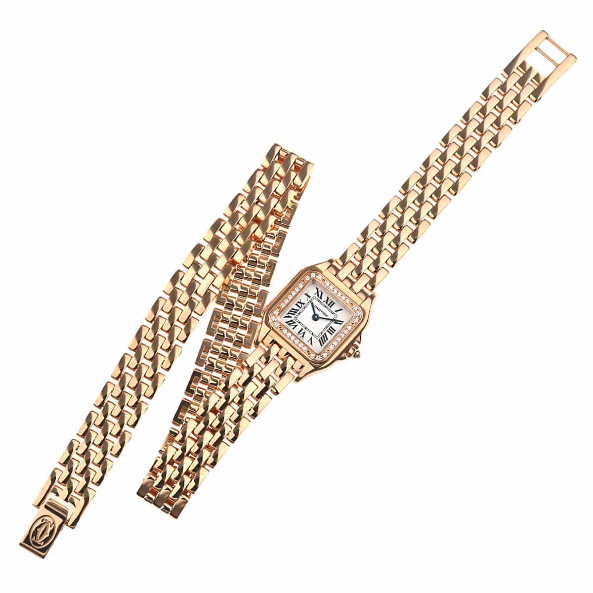 まず、腕に乗せた瞬間の感覚が印象的だ。時計を「着ける」というより、「肌に沿わせる」という表現のほうが近い。パンテール特有のブレスレットは、一つ一つのコマが非常に小さく、手首の動きに合わせて滑らかに追従する。金属ブレスレットにありがちな硬さや冷たさがほとんどなく、むしろシルクのような柔らかさすら感じる。この着用感の良さは、日常的に使うほどにありがたみが増していく。