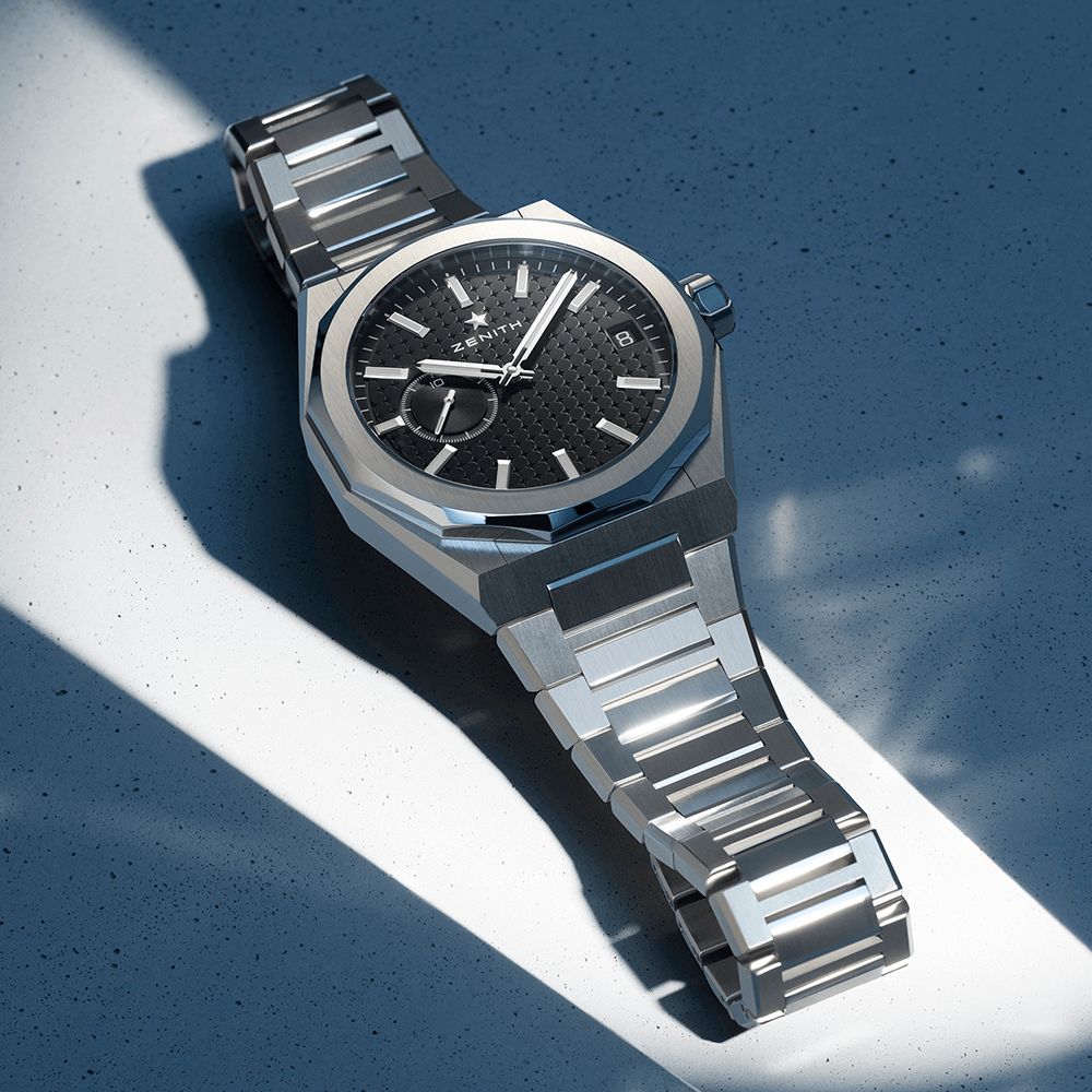 このモデル最大の特徴の一つが、文字盤デザインだ。ブルーを基調としたダイヤルには、ゼニスの象徴である四芒星が幾何学的にパターン化されている。光の当たり方によって陰影が生まれ、平面的ではない奥行きを感じさせる。この文字盤は写真で見る以上に実物が美しい。屋外の自然光、室内照明、夕方の斜光線、それぞれで異なる表情を見せ、思わず何度も腕元を見返してしまう。時計を見るという行為が、単なる時間確認ではなく、小さな楽しみに変わる瞬間だ。