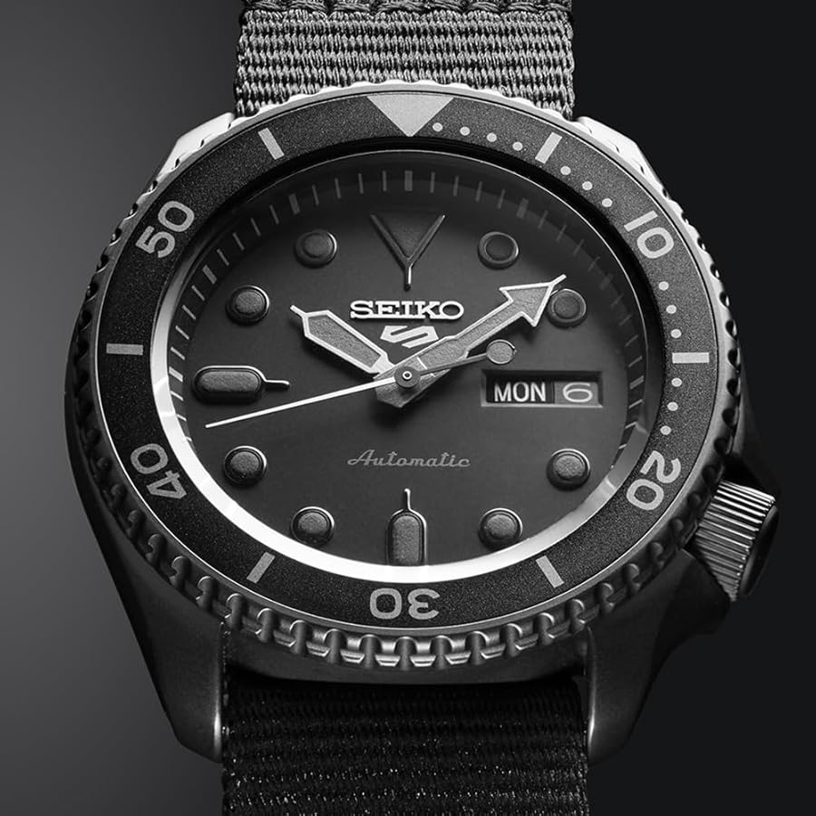 リューズガードは控えめで、ケースラインは滑らか。ベゼルは機能的でありながら視覚的なノイズを抑えている。全体として、セイコー5スポーツの「ハードで実用的」という性格を残しつつ、日常のカジュアルからきれい目まで幅広いスタイルに対応できるデザインとなっている。