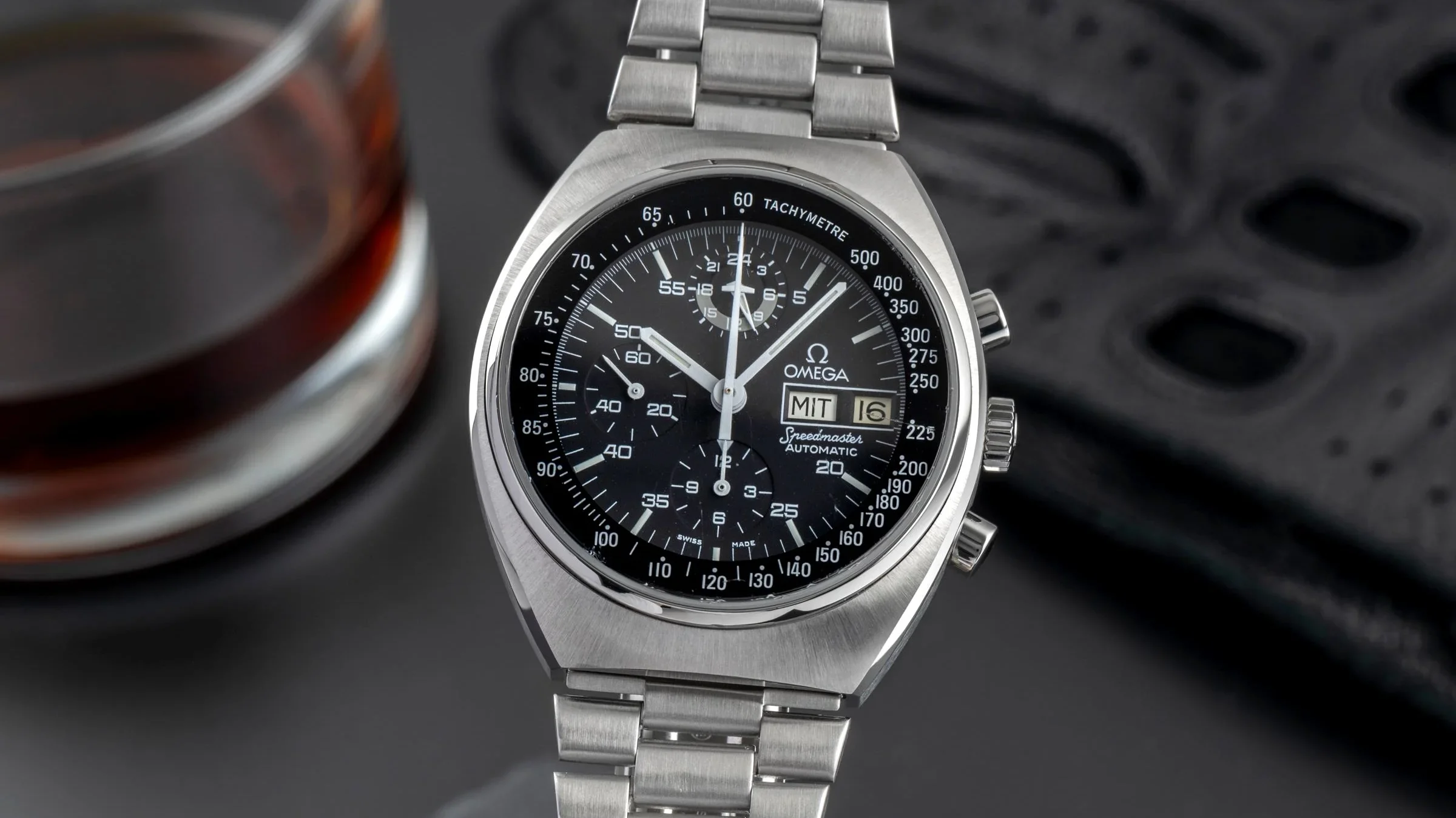 まず外観について語らずにはいられない。いわゆる「マーク4.5」と呼ばれるこのモデルは、分厚く、どっしりとしたトノー型ケースが特徴的で、初めて手に取った瞬間にその存在感に圧倒される。現代のスピードマスターと比べても明らかにボリュームがあり、ケースの塊感は70年代らしい力強さを感じさせる。シャープさよりも重量感を前面に出したデザインで、良い意味で洗練されすぎていない。