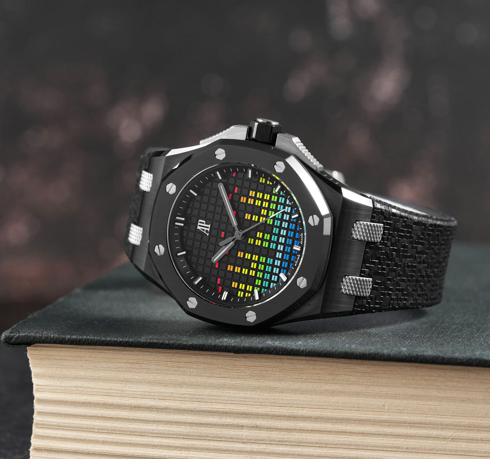 このモデル最大の特徴は、やはり文字盤にある。従来のインダイヤルを排し、ミキサーやイコライザー、VUメーターを想起させる表示へと大胆に再構築されている。最初に見たときは正直、戸惑いもあった。これが本当にロイヤルオークなのか、と。しかし時間をかけて向き合うほどに、その意味が腑に落ちてくる。音楽制作の現場で使われる機材の視覚的要素を、時計の表示として成立させている点は、単なるデザイン遊びではなく、徹底したコンセプト設計の結果だ。