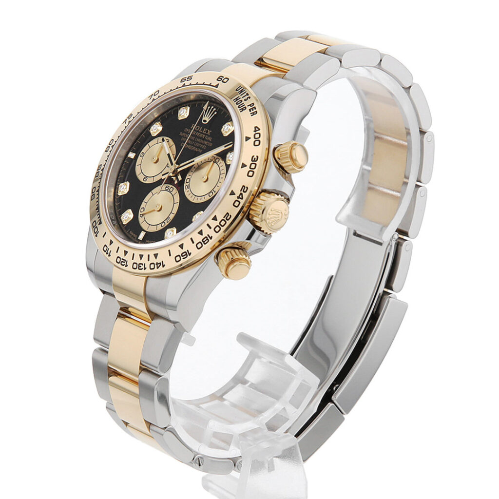 クロノグラフとしての視認性も非常に高い。ブラックとゴールドのコントラストにより、針やインデックスが明確に浮かび上がり、瞬時に情報を読み取ることができる。サブダイヤルの配置やサイズ感も計算され尽くしており、スポーツモデルとしての機能性を損なっていない。ラグジュアリー要素を加えながらも、あくまでデイトナであり続けている点が、このモデルの核だと言える。