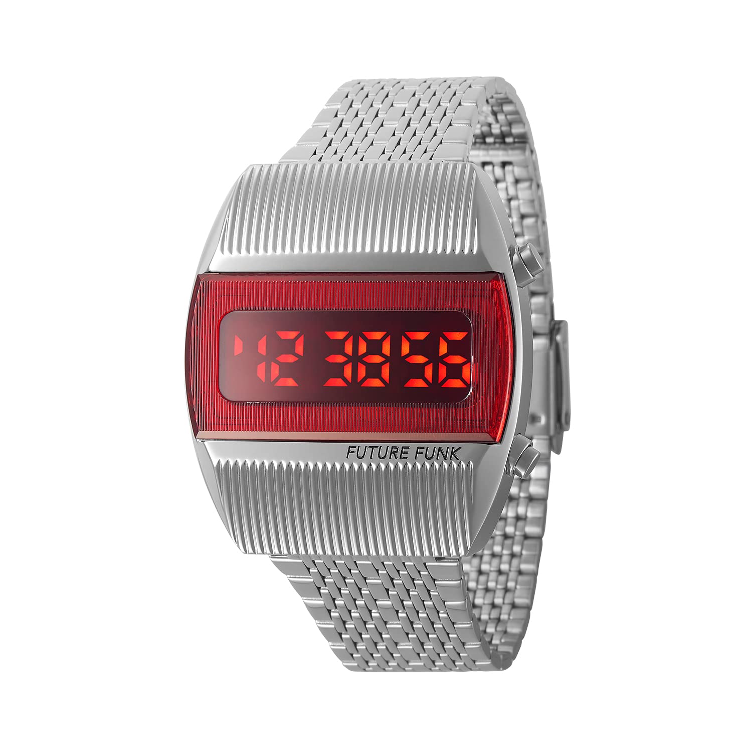 フューチャーファンク LEDウォッチ FF201シリーズ Ref.FF201-SV-MT は、1970年代に登場したLEDデジタルウォッチの思想を、現代の品質で再構築した腕時計である。液晶表示が当たり前となった今、常時点灯しないLED表示をあえて採用している点に、このモデルの個性と美学がはっきりと表れている。時間を確認する際にボタンを押し、赤い数字が一瞬だけ浮かび上がる。その行為自体が、この時計の価値を形づくっている。