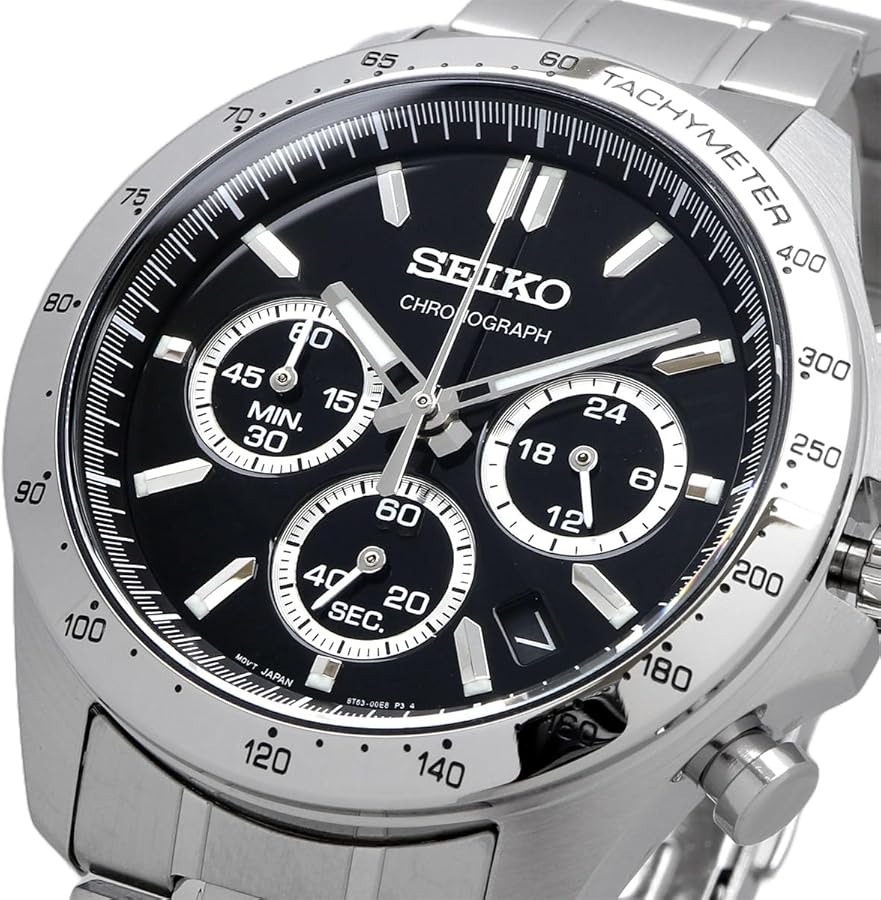 まず、このSBTR013を語る上で欠かせないのが、そのデザインである。ブラックダイヤルを基調としたクロノグラフデザインは王道でありながら、決して野暮ったくならないバランス感覚がある。インダイヤルは3つ配置され、クロノグラフらしいメカニカルな表情を持ちつつも、視認性は高く、情報過多にはなっていない。タキメーターベゼルがスポーティな印象を強めているが、過度に主張することはなく、全体として非常に整った顔つきである。