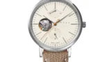 文字盤は朧月という名の通り、白ともグレーとも言い切れない曖昧な色調でまとめられている。光の当たり方や時間帯によって微妙に表情を変え、その変化を意識することで、時間の流れを少し丁寧に感じられるようになる。針やインデックスも最小限に抑えられており、視認性を保ちながら静かな美しさを成立させている。