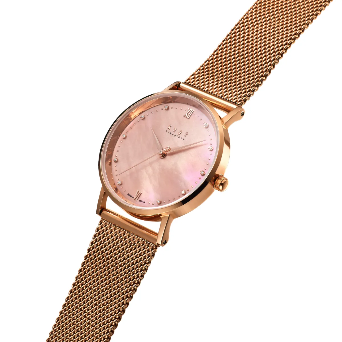 まず印象的なのは、ケースからブレスレットまで統一されたローズゴールドカラーの上品さである。一般的にローズゴールドは華やかさが先行しがちだが、このモデルでは色味が抑えられており、肌なじみが非常に良い。光を強く反射するというより、柔らかく包み込むような輝きがあり、派手さよりも落ち着きが感じられる。そのため、アクセサリー感覚で身につけられる一方で、時計としての品格も失われていない。
