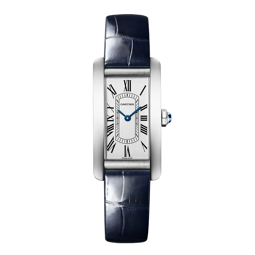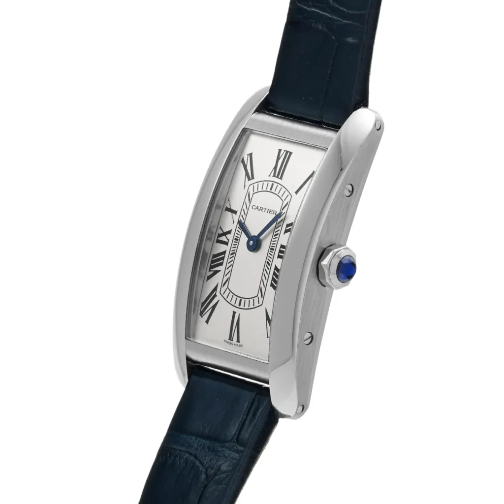タンクアメリカンというシリーズ自体が、カルティエの中でも特にエレガンスを重視した系譜に位置づけられている。その中でSMサイズのRef.WSTA0082は、過度に主張することなく、しかし確かな存在感を放つ絶妙なバランスを備えている。ケースは縦長のレクタンギュラー型で、手首のラインに自然に沿うよう緩やかなカーブを描いている。この曲線があることで、見た目の美しさだけでなく装着感の良さにも大きく貢献している。