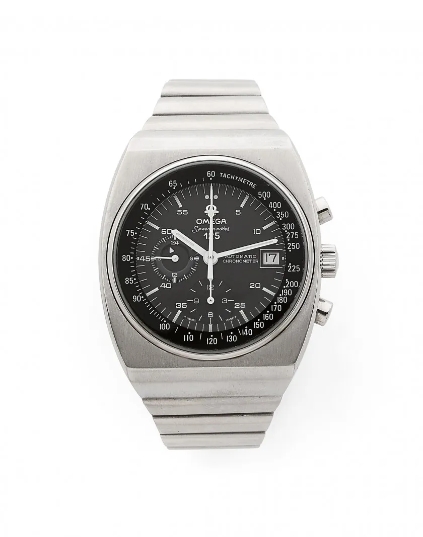 スピードマスター125は、オメガ創業125周年を記念して製作されたモデルであり、その成り立ちからして特別である。最大の特徴は、自動巻きクロノグラフムーブメント **Cal.1041** を搭載している点だ。このムーブメントは、世界で初めてクロノグラフとして公式にクロノメーター認定を受けたものであり、精度に対する当時のオメガの強い自信がそのまま形になっている。単なる記念モデルではなく、技術的な挑戦を伴った「本気の節目」であったことが分かる。