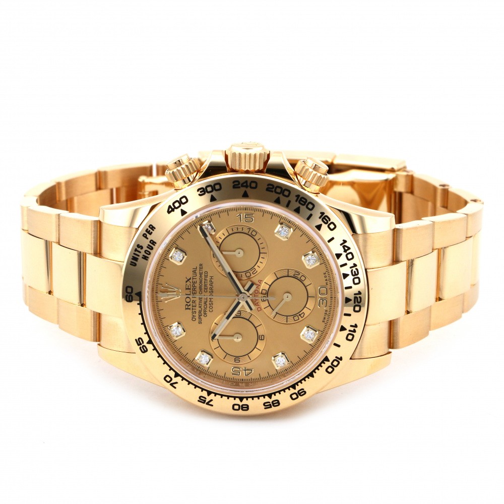 シャンパンゴールドの文字盤は、光の当たり方によって表情を変え、単調になりがちなゴールド一色の世界に奥行きを与えている。ダイヤモンドインデックスも装飾的でありながら主張しすぎず、全体のバランスを崩さない。ブラックのインダイヤルとのコントラストにより視認性も高く、見た目の華やかさとは裏腹に、道具としての実用性がしっかりと保たれている点は、さすがデイトナだと感じる部分だ。