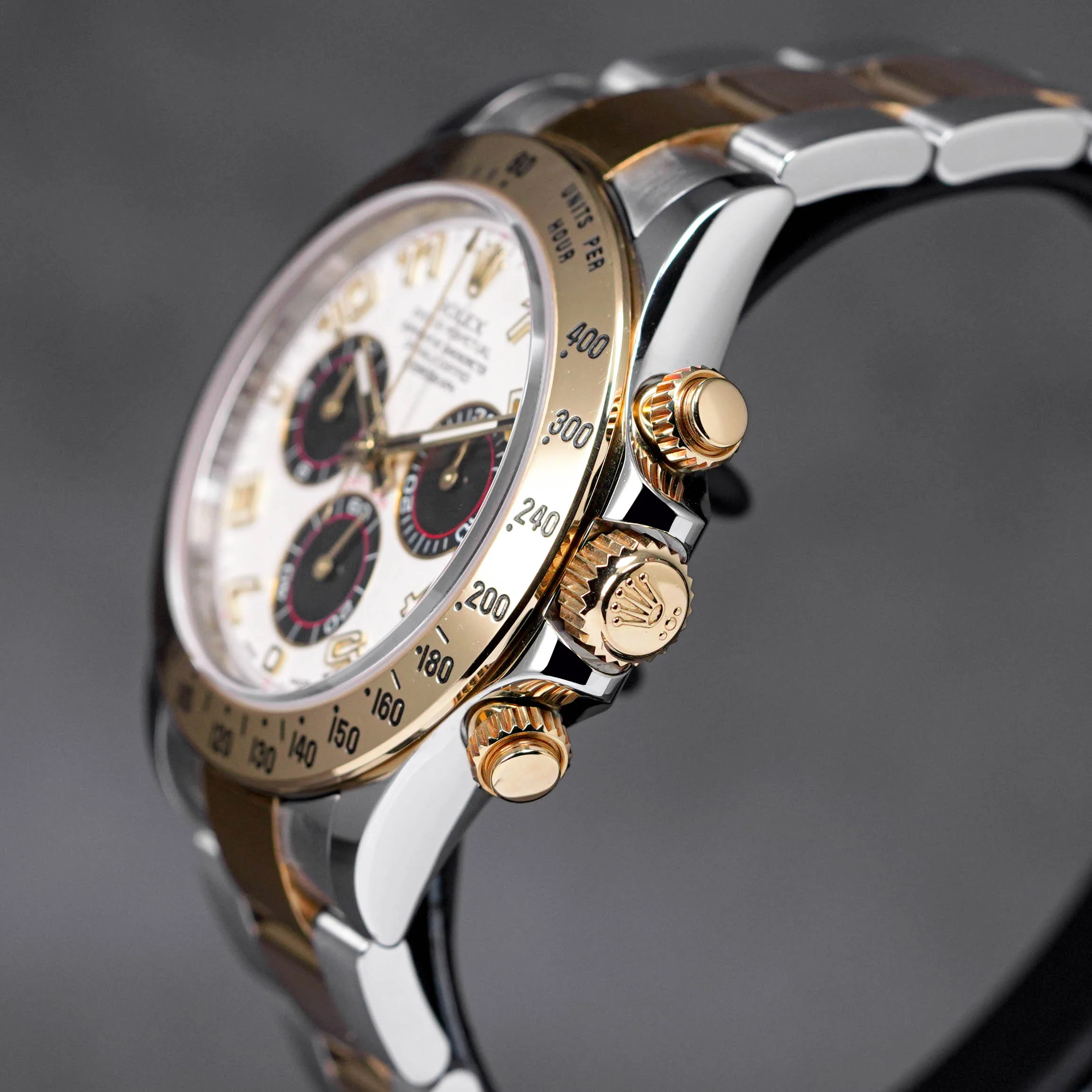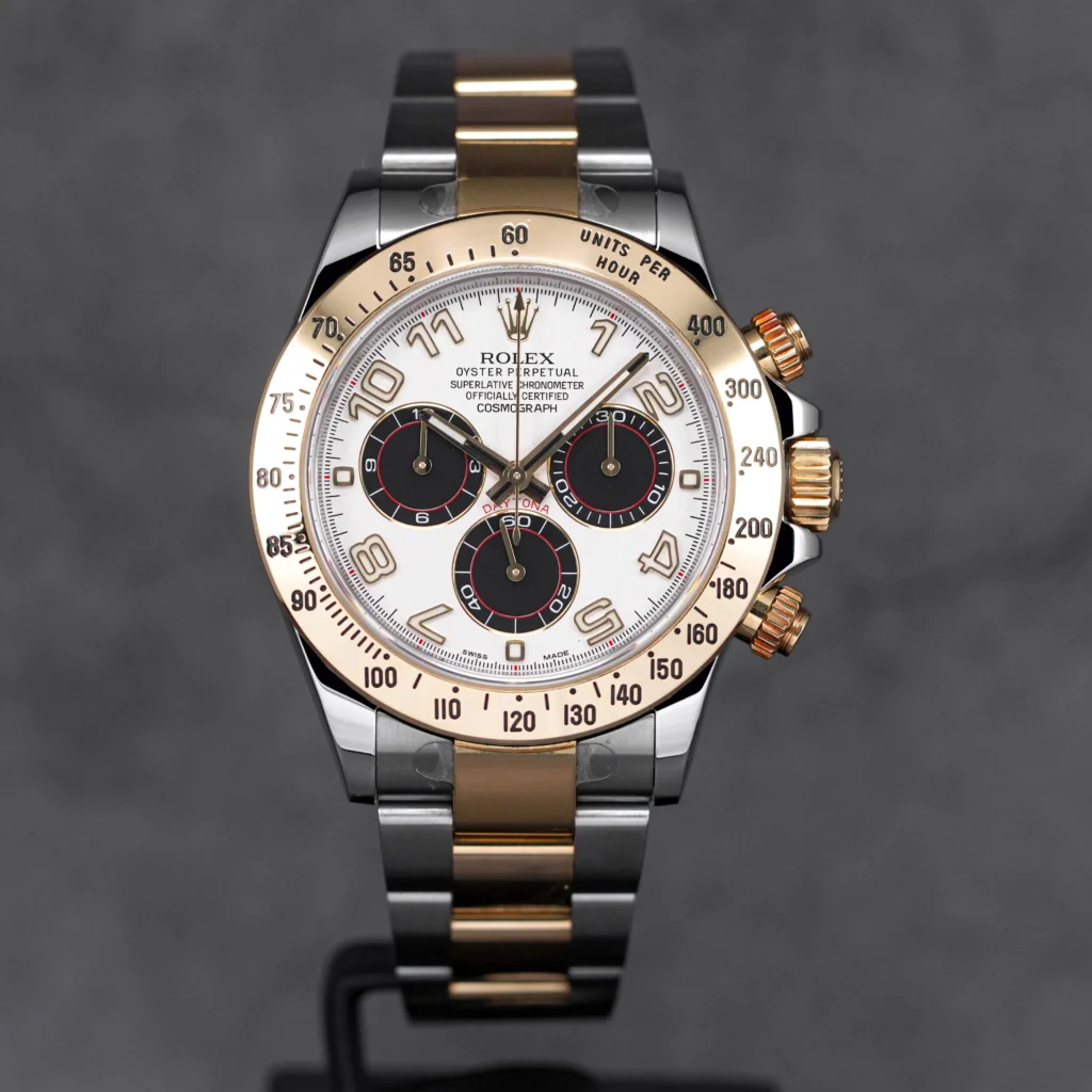 ロレックス デイトナ ホワイト/ブラック/アラビア文字盤 Ref.116523は、デイトナというモデルが持つスポーツ性と華やかさ、その両方を真正面から受け止めた一本である。ステンレススチールとイエローゴールドのコンビという時点で、すでに存在感は十分だが、このモデルはそこにアラビア数字という強い個性を加えることで、さらに一段階踏み込んだ表情を持っている。