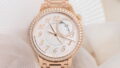 ケースの仕上げも非常に丁寧だ。ポリッシュとサテンの使い分けが明確で、光の当たり方によって表情が変わる。特にエバーローズゴールド部分は、柔らかく反射するため、強い照明の下でも嫌味がない。長時間見ていても疲れず、むしろ時間が経つほどに愛着が増していく。
