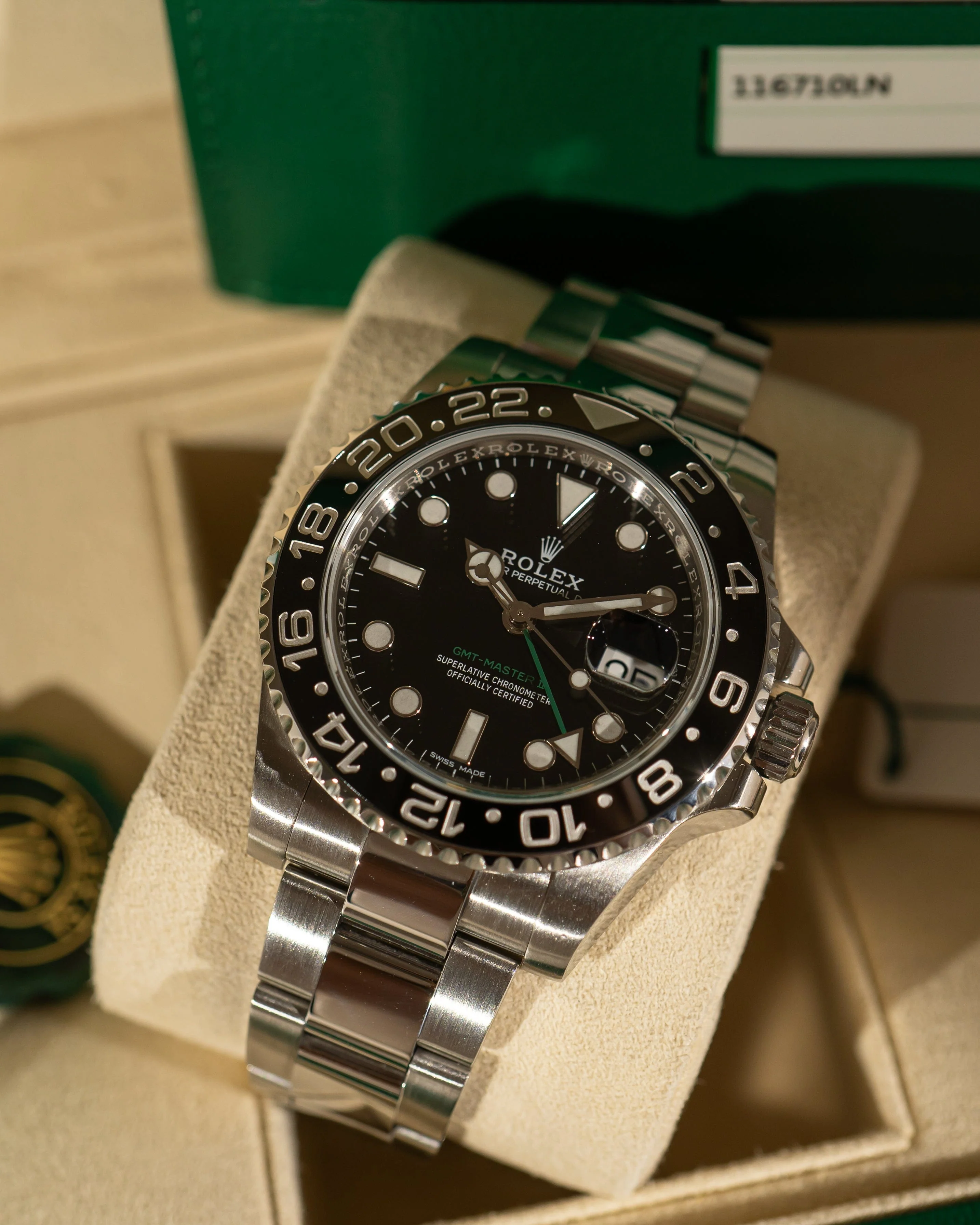 視認性の高さもRef.116710LNの大きな魅力である。黒文字盤に白いインデックスと針の組み合わせは非常に見やすく、グリーンのGMT針がさりげないアクセントとして機能している。暗所での夜光の発光も均一で、時間を確認するという腕時計本来の役割を確実に果たしてくれる。この安心感は、日々の生活の中で確実に効いてくる。