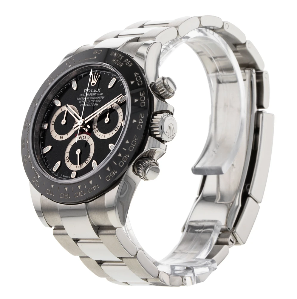 まず最大の魅力として挙げられるのが、ブラックダイヤルとセラクロムベゼルが生み出す圧倒的な完成度である。Ref.116500LNは、ステンレススチール製ケースにブラックのセラミックベゼルを組み合わせた初のデイトナであり、この仕様変更によってデイトナは新たなステージへと進化した。ブラックベゼルは傷に強く、経年による色褪せもほぼ起こらないため、長年使い続けても美しさを保ちやすい。その一方で、艶のあるブラックは高級感を強く放ち、スポーツモデルでありながらドレスウォッチのような品格も感じさせる。