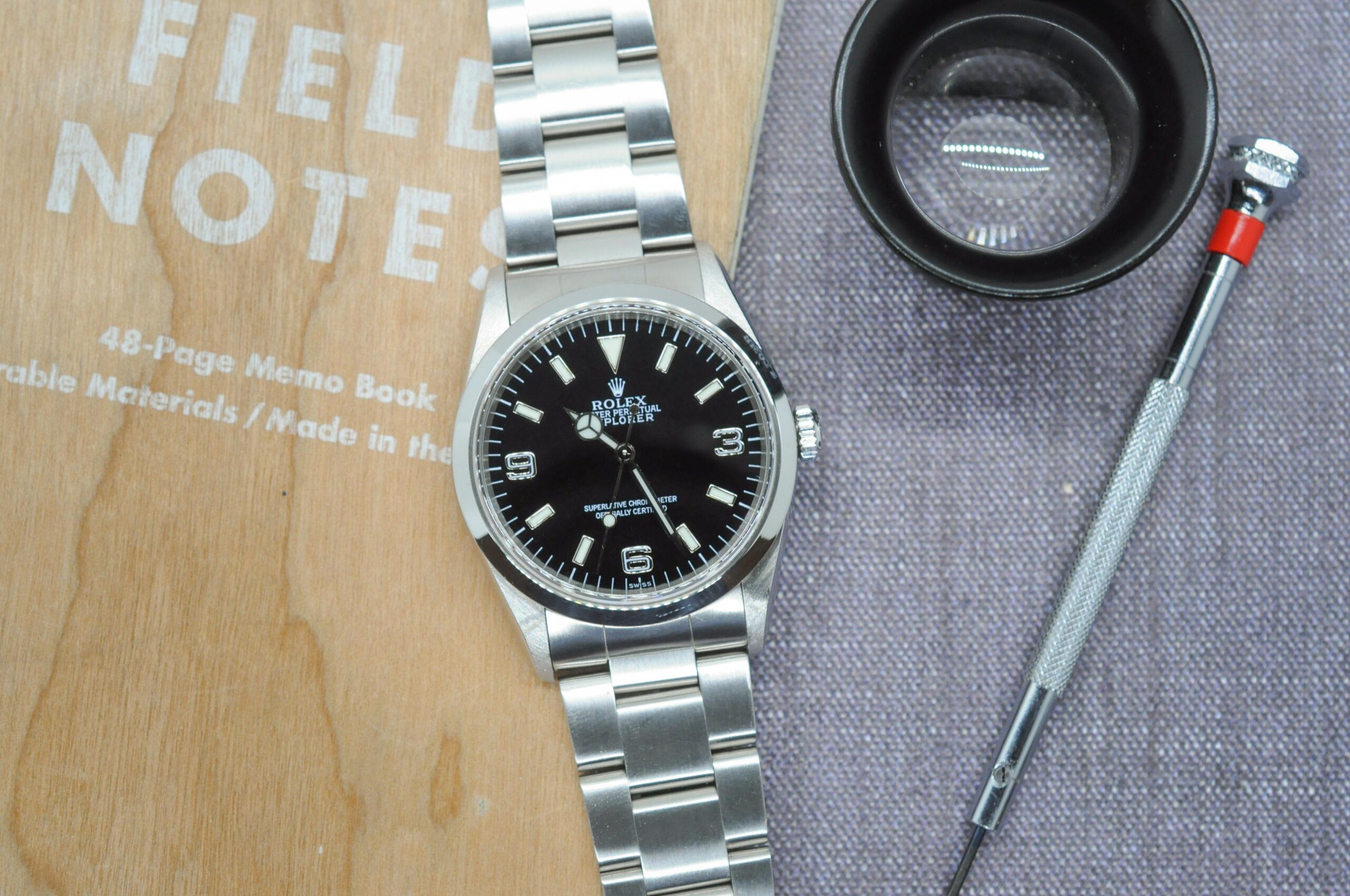 ロレックス エクスプローラーI Ref.14270は、派手な装飾や分かりやすい高級感とは距離を置きながら、長く使うことで本質的な価値が伝わってくる時計である。初めて手にした瞬間に感じるのは、その驚くほどのシンプルさだ。ブラックダイヤルに3・6・9のアラビア数字、無駄を削ぎ落としたインデックス配置は、視覚的に非常に整理されており、時間を知るという目的だけに集中していることが伝わってくる。