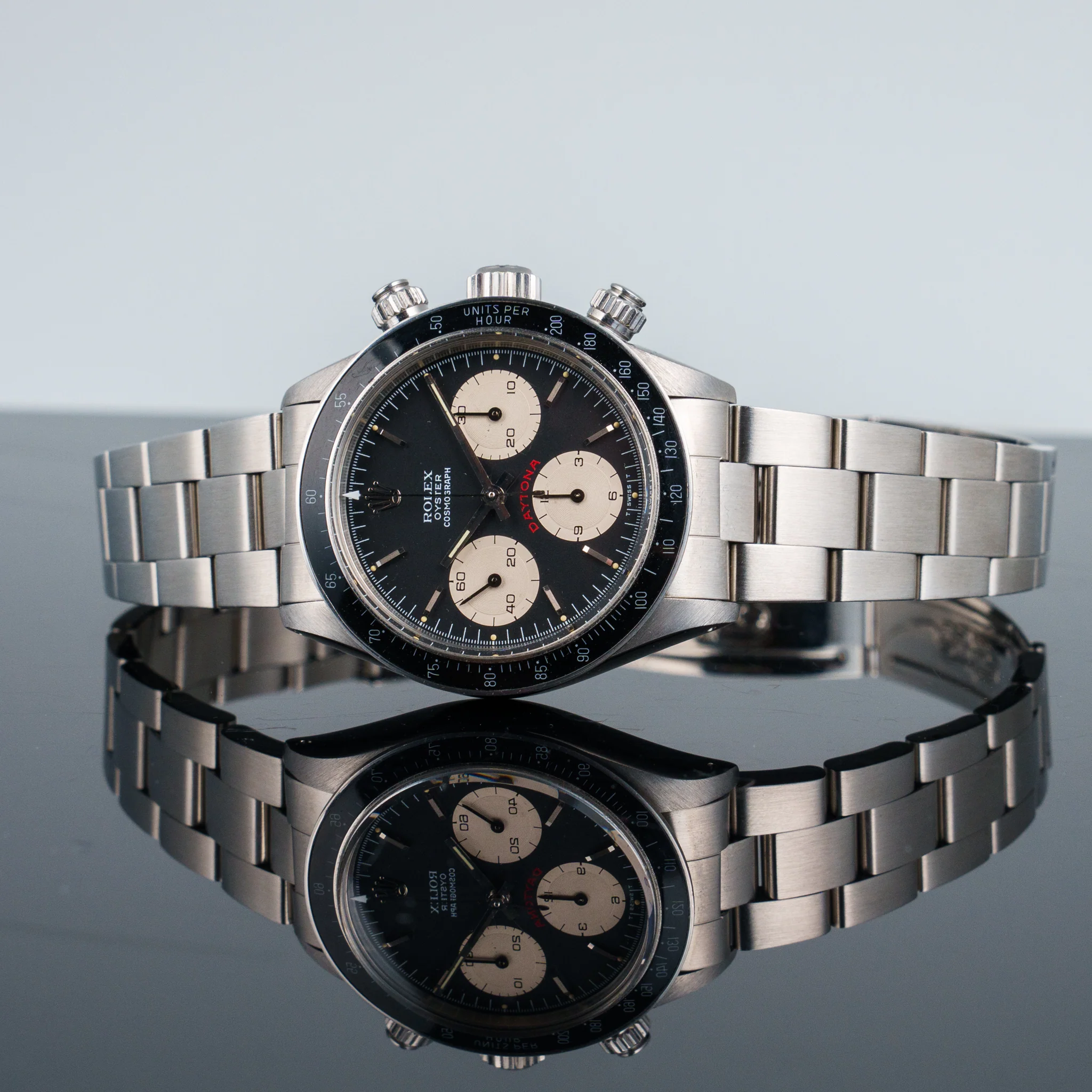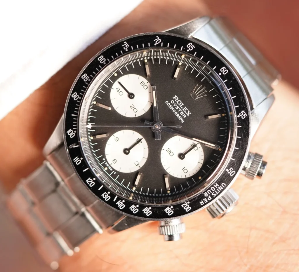 まず、このRef.6263を手に取った瞬間に感じるのは、現代のデイトナとは明確に異なる空気感だ。ケースサイズは37mm前後と小ぶりで、厚みも抑えられている。数字だけを見ると華奢に思えるが、実物は驚くほど芯が強い。金属の塊としての密度が高く、軽いのに頼りない印象は一切ない。むしろ「余計な肉を削ぎ落とした結果、こうなった」と言いたくなるような潔さがある。