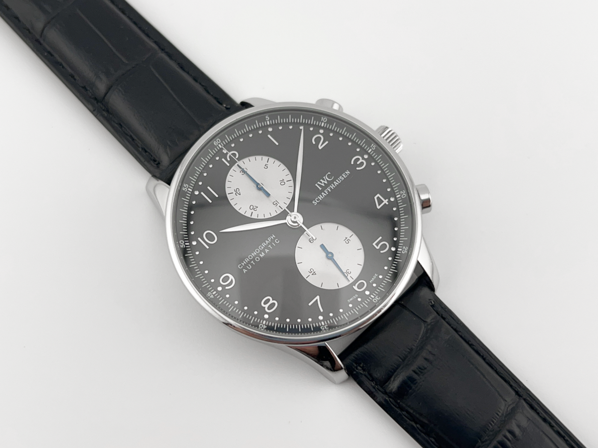IWC ポルトギーゼ クロノ オートマチック Ref.IW371404は、ポルトギーゼシリーズの中でも非常に人気の高いモデルであり、機能性とデザインの美しさを兼ね備えたクロノグラフである。ポルトギーゼシリーズはIWCの中でも歴史的に長い伝統を持つラインであり、1920年代に船舶用の精密時計として開発された背景を持つ。そこから受け継がれる「視認性の高い文字盤」と「端正でクラシックなデザイン」の哲学が、Ref.IW371404にもしっかりと息づいている。