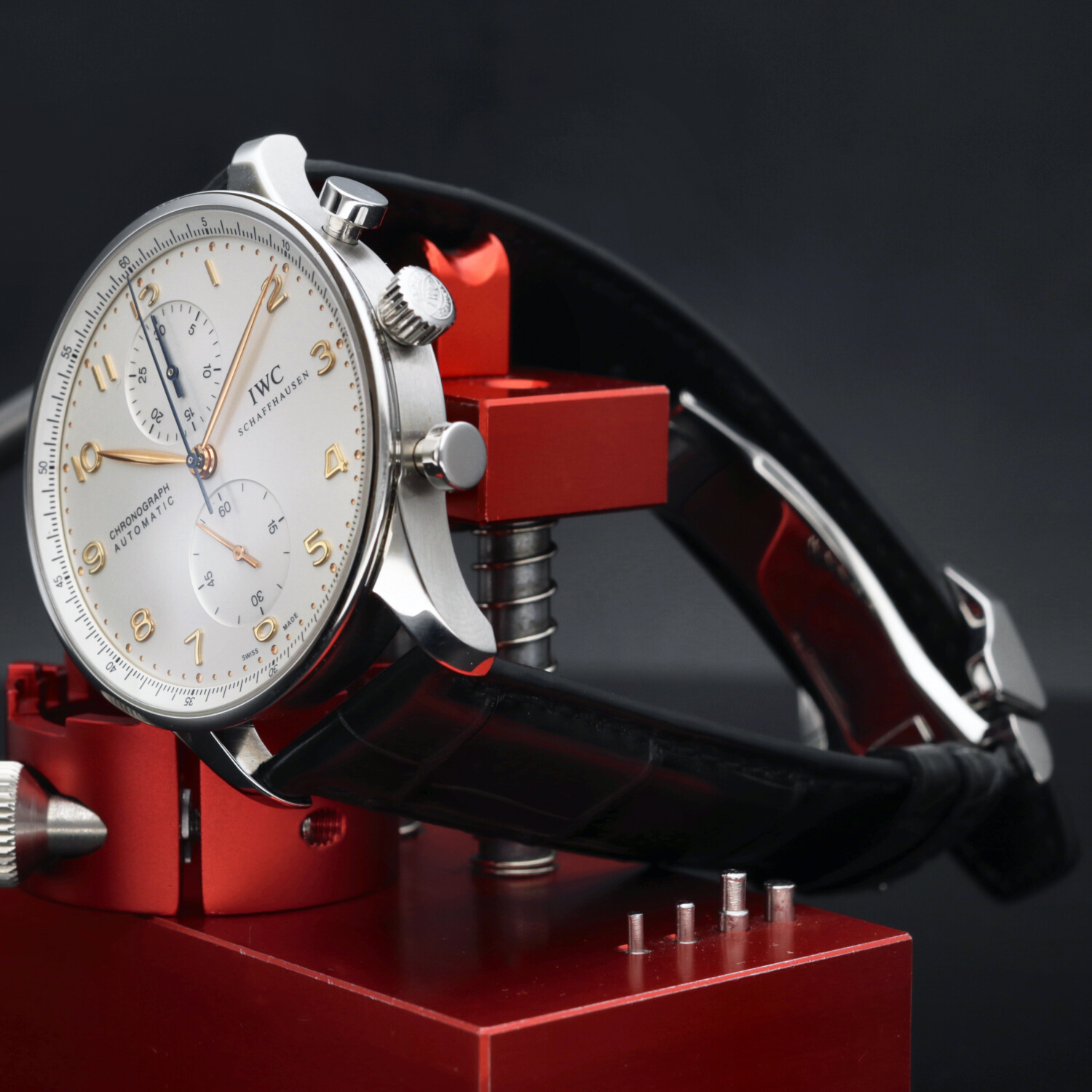 このモデルにはIWC自社製の自動巻きムーブメント「キャリバー79350」が搭載されており、クロノグラフの操作性は非常にスムーズである。リューズとプッシャーの操作感は軽やかで、カチッとした押し心地が心地よく、クロノグラフを動作させる楽しさを実感できる。私自身もこのモデルを実際に数か月使用しているが、ストップウォッチ機能を日常的に使うことは少ないものの、必要なときに正確に作動する信頼性は大きな安心感につながる。特にタイムトライアルやランニングなどの場面で、秒単位の計測が容易である点は、単なるドレスウォッチ以上の実用性を感じさせる。