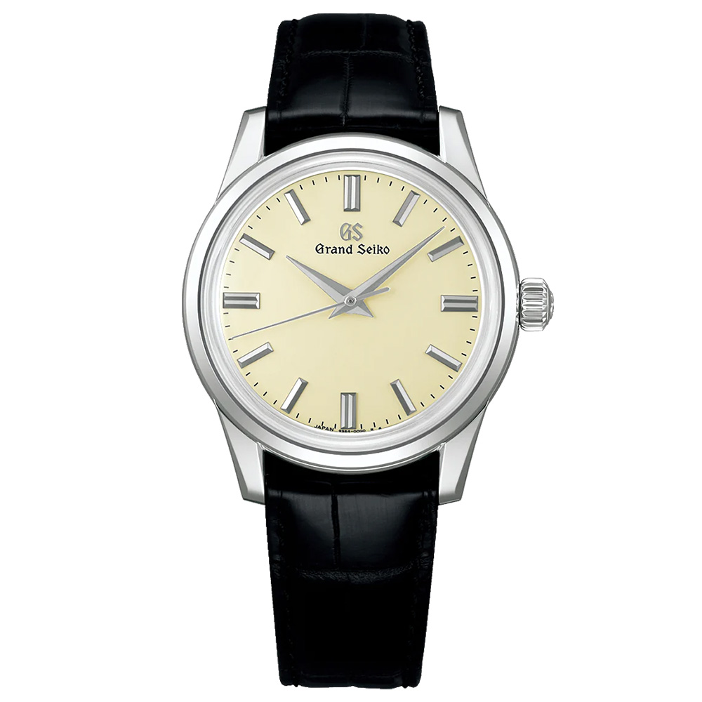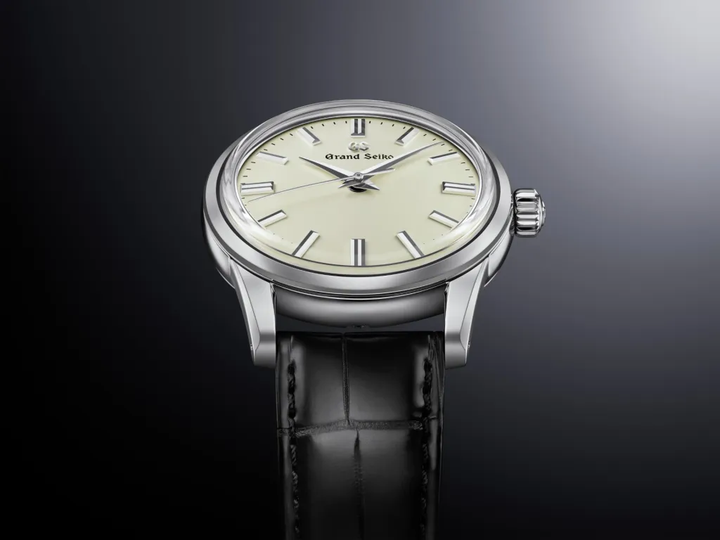 文字盤は柔らかなアイボリーカラーで、光の当たり方によって微妙に表情を変える。この色味が非常に上品で、純白でもなく、黄色味が強すぎるわけでもない。長時間眺めていても疲れない色調であり、時間を確認するたびに心が落ち着く。インデックスと針はシンプルだが、グランドセイコーらしいシャープさと精密さを併せ持っており、どの角度から見ても歪みがない。特に針の仕上げは見事で、光を受けると静かに輝き、過剰な主張をせずに存在を伝えてくる。