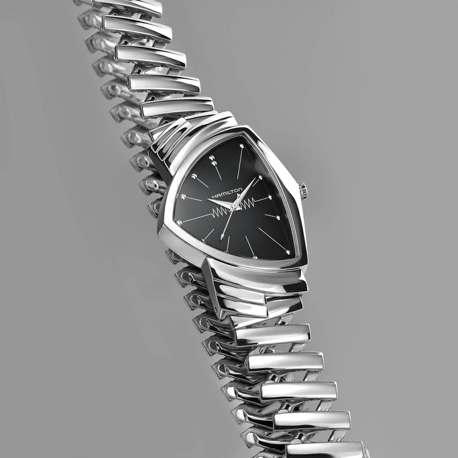 ベンチュラといえば、1957年に世界初の電池式腕時計として登場した歴史的モデルであり、三角形のケースデザインは時計史においても極めて異端である。Ref.H24411232は、その象徴的なデザインを現代的に解釈しつつ、フレックスブレスレットを組み合わせることで、クラシックとモダンを独特のバランスで融合させている。