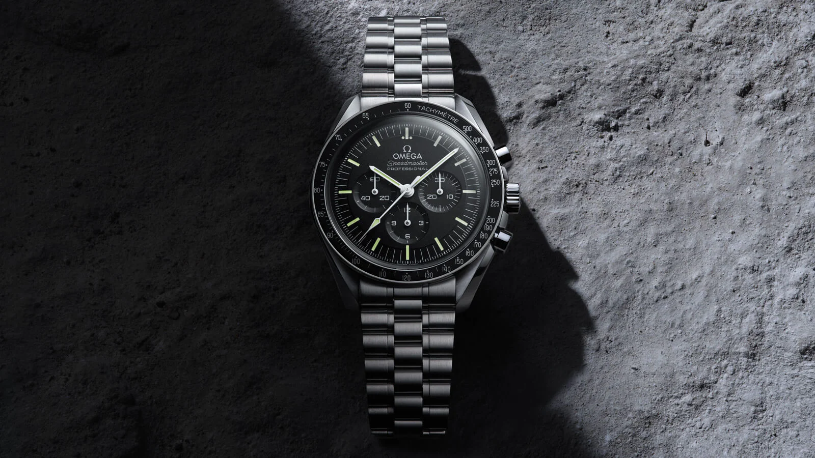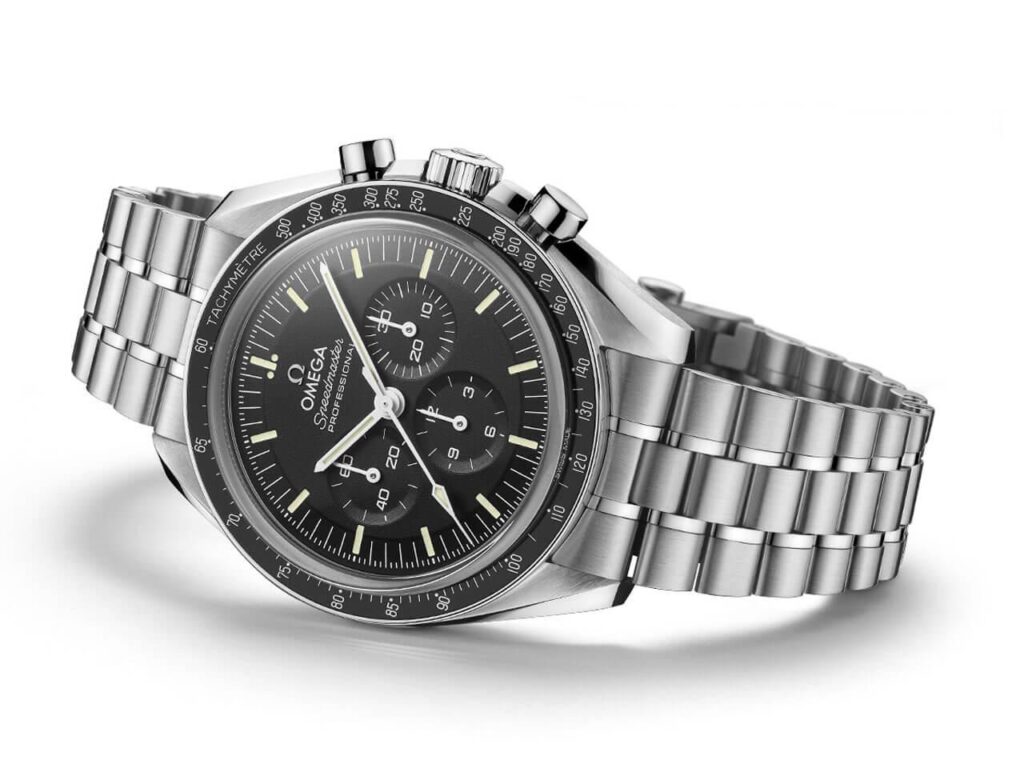 ブラックダイヤルは極めてオーソドックスだが、細部を見れば見るほど完成度の高さが伝わってくる。ステップダイヤルの立体感、ホワイトのインデックスと針のコントラスト、クロノグラフ秒針の視認性など、どれも計算され尽くしている印象だ。インダイヤルの配置は伝統の3・6・9配置を守り、スピードマスターらしいスポーティさと計器感を強く感じさせる。夜光の発光も均一で、暗所でも時間を読み取りやすい。