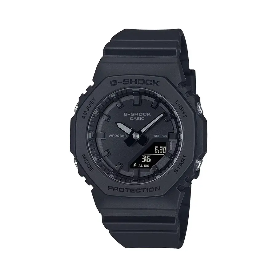 カシオ G-SHOCK 2100シリーズのRef.GMA-P2100BB-1AJFは、オールブラックのミニマルなデザインが特徴的な腕時計である。G-SHOCKならではの耐衝撃構造と20気圧防水機能を備えながら、従来の2100シリーズよりも軽量化されており、手首への負担をほとんど感じずに装着できる点が魅力である。ケースやベゼル、バンドまで黒で統一され、マットな質感が光を反射しすぎず、カジュアルからビジネスまで幅広いコーディネートに馴染むデザインとなっている。