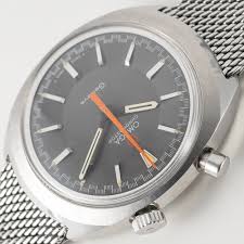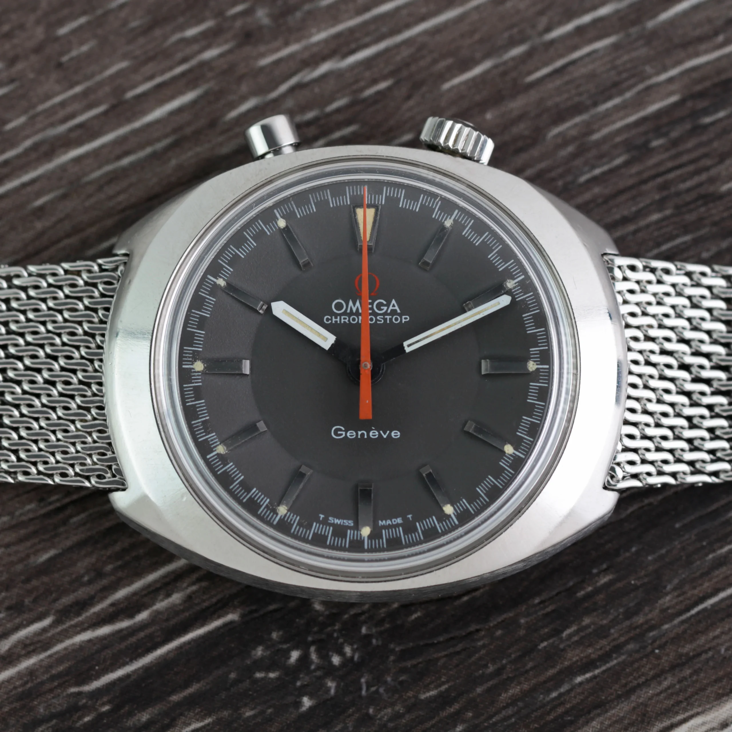 オメガ ジュネーブ クロノストップ ドライバーモデル Ref.145.010は、1960年代後半から1970年代にかけて生まれた独特の発想を色濃く残すクロノグラフであり、現在の時計とはまったく異なる思想と使われ方を前提に設計された点に、強い魅力が宿っている。最大の特徴は、ケースが通常の腕時計のように手首の上側ではなく、手首の外側、つまりドライバーがハンドルを握ったまま視線を落とした際に自然と時間を読み取れる角度で配置されていることで、この大胆な構造だけでも当時のモータースポーツ文化と密接に結びついた背景が想像できる。