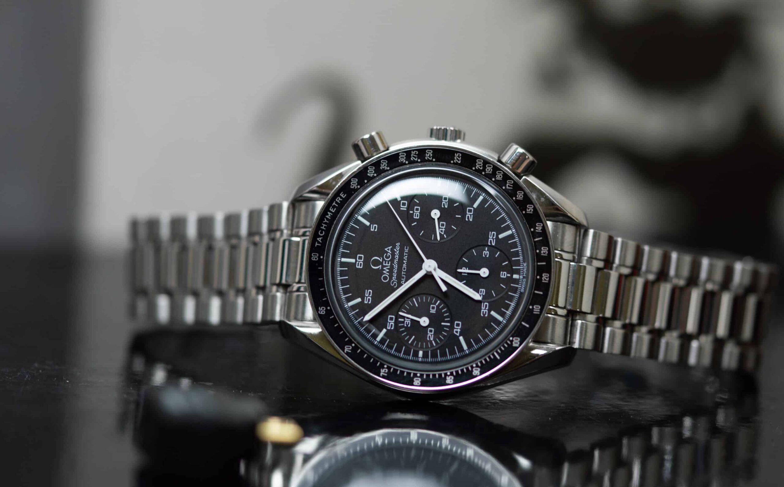 オメガ スピードマスター オートマティック Ref.3510.50は、手に取った瞬間から時間を計る道具以上の存在であることを感じさせる時計である。初めて腕に巻いたとき、その重量と厚みから生まれる存在感は、単なるアクセサリーやファッションアイテムとは異なる印象を与え、手首に伝わる重みが時計の精密さと耐久性を直感的に理解させてくれる。私はこの時計を初めて身につけたとき、文字盤の奥行きや針の動きの滑らかさに驚きながら、これまでの時計に対するイメージが大きく変わったことを覚えている。特にクロノグラフ機能のボタンを押したときのレスポンスの良さは、操作する手に確かな満足感を与え、単純に秒を計るだけではなく、時計そのものとの対話のような感覚さえも生まれる瞬間であった。