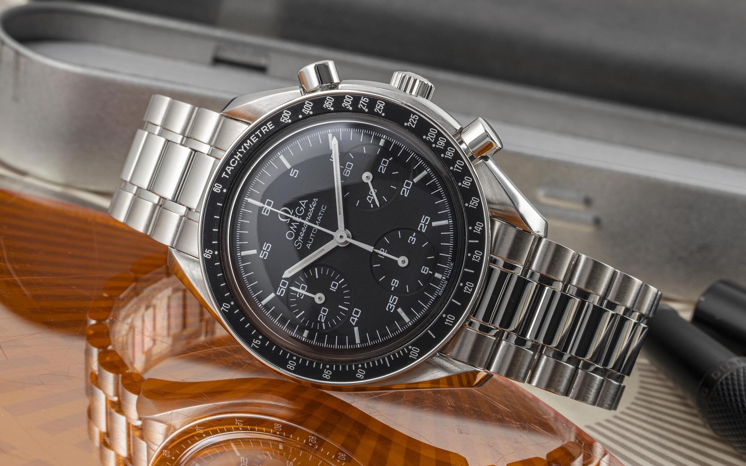 デザイン面でもRef.3510.50は非常に洗練されている。ブラック文字盤とタキメーターベゼルのコントラストはスポーティでありながら落ち着きがあり、クロノグラフインダイヤルは視覚的に整然としている。過度な装飾を避けたことで、ビジネスやフォーマルな場面でも違和感なく使用でき、かつ手首での存在感はしっかりと伝わる。スポーツクロノグラフとしての精悍さと日常使いの実用性を高度に両立させたデザインであり、オメガの時計作りのこだわりを体感できる部分である。