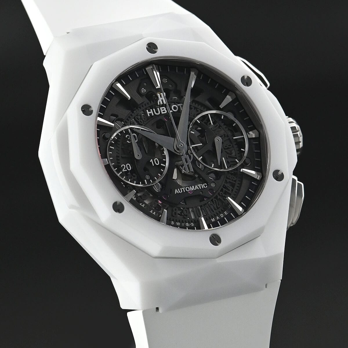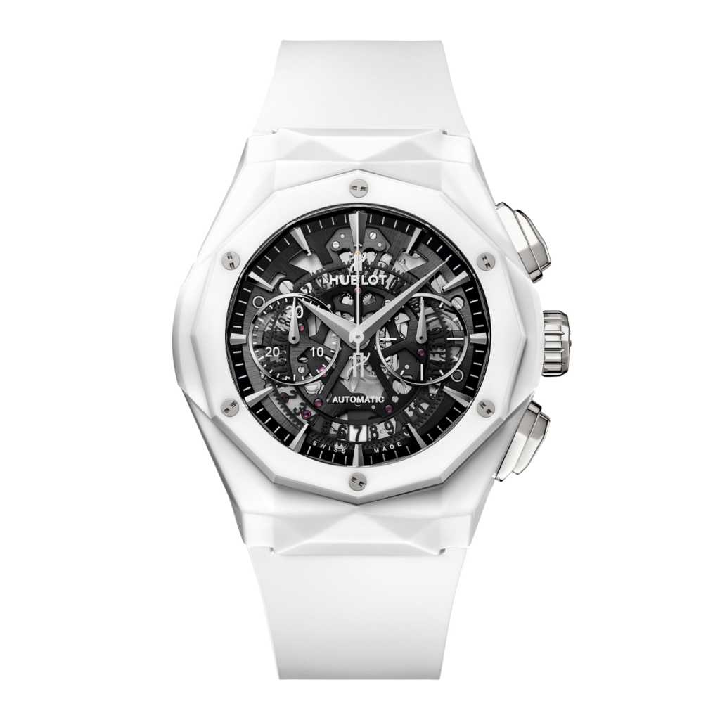 このモデルのケースとベゼルにはホワイトセラミックが採用されている。セラミック素材は軽量かつ耐傷性に優れ、日常の使用において高い耐久性を発揮するだけでなく、白い外観が清潔感ある印象を与える。45mm径というサイズ感は、スポーツウォッチらしい力強さと、同時に彫刻的デザインが持つアート性を両立させている。文字盤はスケルトン仕様で、内部の動きを覗き見ることができるよう設計されており、機械式クロノグラフの構造美を視覚的に楽しめる。
