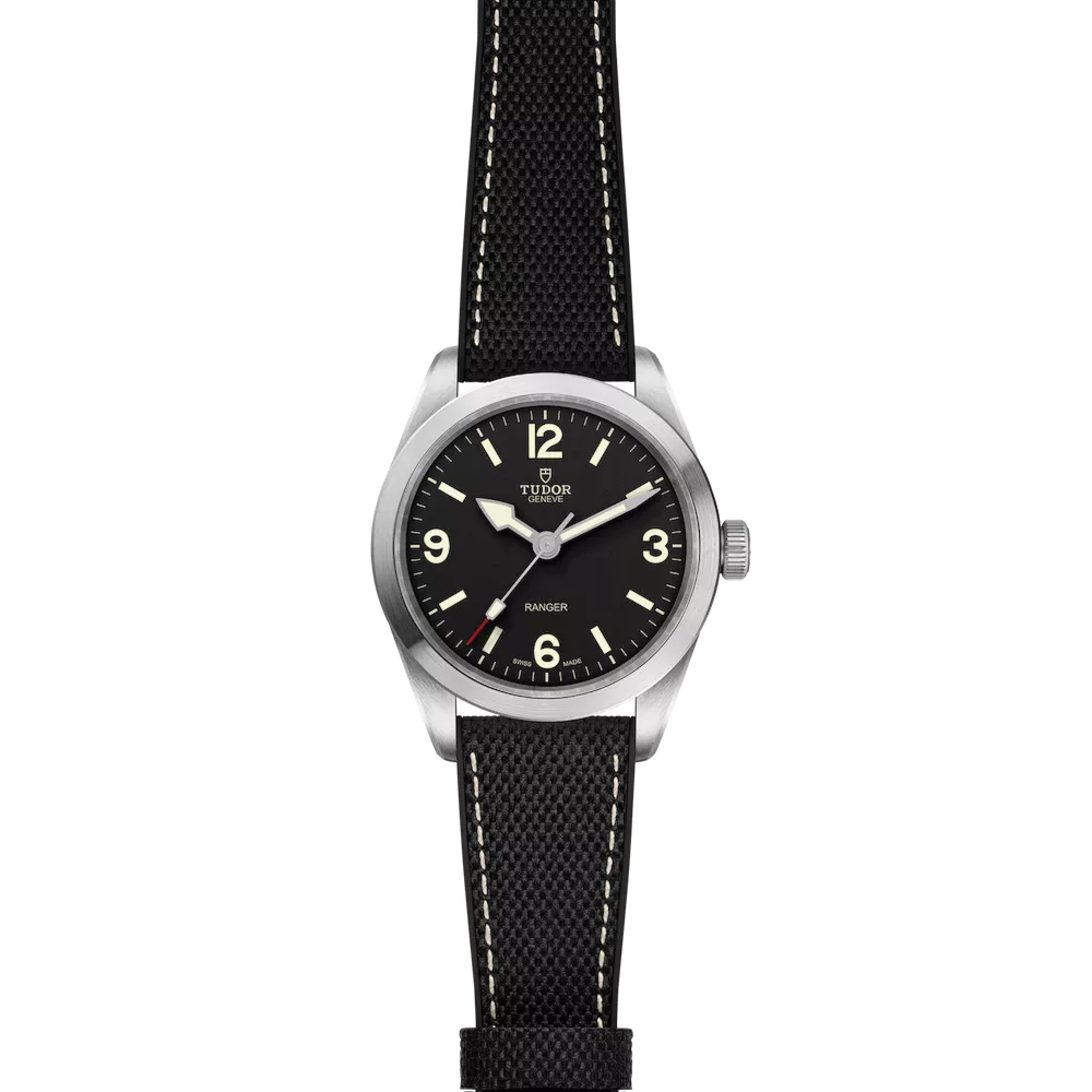 チューダー レンジャー Ref.79950‑0002は、英国海軍による北グリーンランド遠征探検70周年を記念して登場したツールウォッチの精神を現代に受け継ぐモデルで、39mm径のステンレススチールケースに自動巻きムーブメント「MT5402」を搭載した腕時計である。MT5402はCOSC(スイス公認クロノメーター)認定を取得し、約70時間のパワーリザーブを備える高精度・高信頼性の自社製ムーブメントで、日常使いからスポーツ用途まで幅広く対応できる実力を持つ。加えて、防水性能は100mを確保しており、スポーティなシーンでも安心感がある。