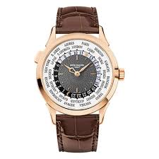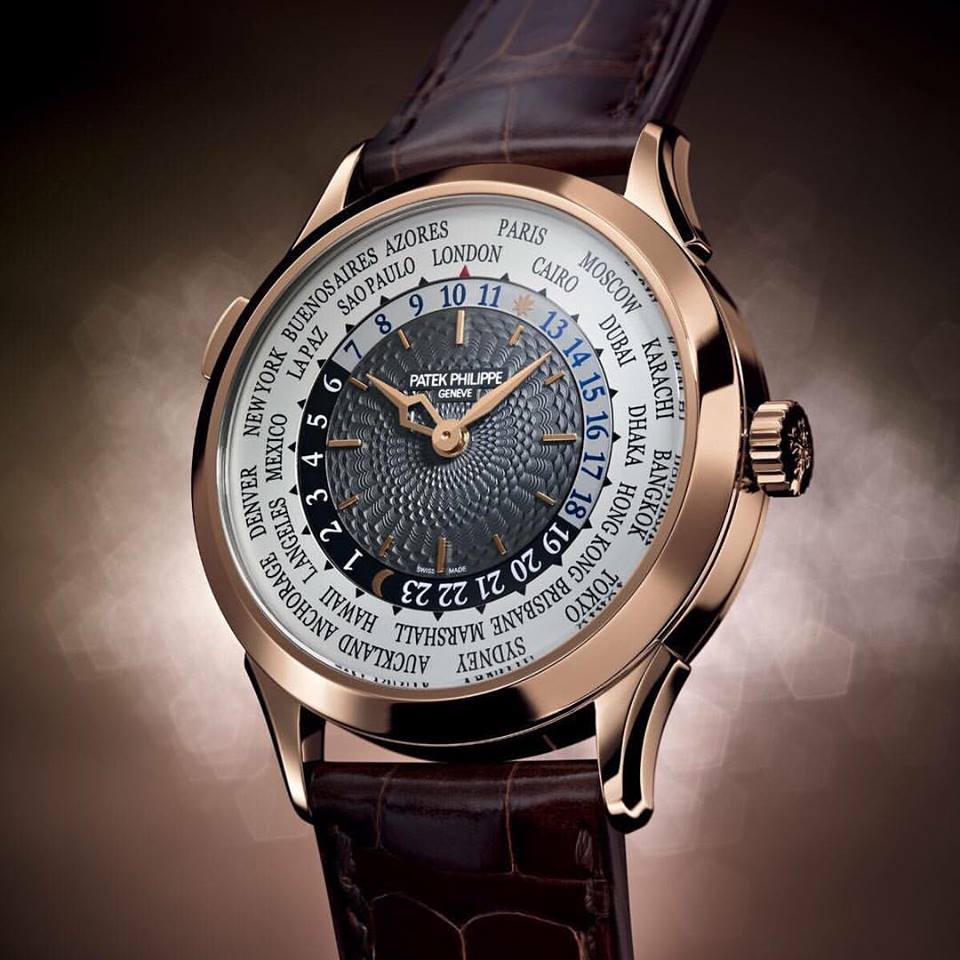 私が長いあいだ惹かれ続け、ついに手にした時計が**パテック フィリップ コンプリケーション ワールドタイム Ref.5230R‑001**である。パテックフィリップのワールドタイムは、その複雑機構とエレガントなデザインから世界中の時計愛好家が夢見るモデルであり、5230R‑001はそのなかでもローズゴールドケースとギョーシェの文字盤が優雅に調和した、個人的にも特別感を強く抱く一本である。まずこの時計に触れたときに感じたのは、ケース径38.5mmというサイズ感が思った以上に手首に馴染むことだった。ほどよい存在感を保ちつつ、決して主張しすぎない落ち着きを持たせているそのバランス感覚は、単純な数字以上に計算された美しさを感じさせた。このサイズは、カジュアルな装いにもフォーマルな装いにも合わせやすく、時としてスーツの袖口から覗くこの時計を見ては、自然と気持ちが引き締まるような感覚を覚えることがある。