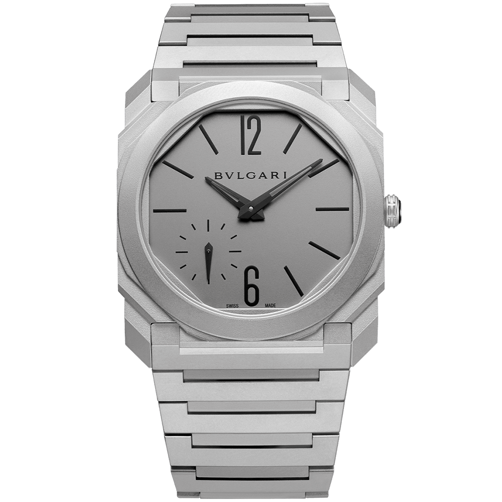 このモデルは極薄設計の自動巻き時計である。ケース径は40mm、総厚さはわずか5.15mmという驚異的な薄さを誇るとされ、搭載されるムーブメント「BVL 138 – フィニッシモキャリバー」自体の厚さは2.23mmと驚くほど薄いものだと公式スペックで示されている。素材はチタンで、ケース・ブレスレット・ダイヤルまで統一されたグレーの質感で仕上げられている。チタン製であるため軽量で装着感が抜群で、チタンならではの控えめだが深みのあるマットな質感は、他の高級時計とは一線を画す雰囲気を持つ。ムーブメントは自動巻きで約60時間のパワーリザーブを実現しており、薄さを追求しつつ実用性も十分に担保されている。これらはすべてブランド公式サイトや正規販売店のスペック紹介から確認できる事実である。