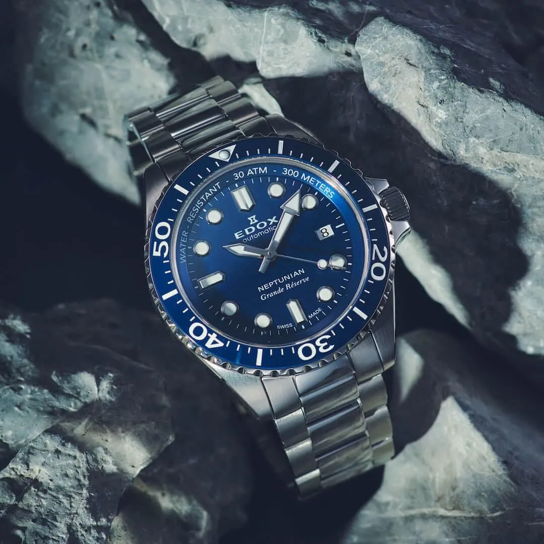 エドックス ネプチュニアン グランデ リザーブ デイト オートマティック Ref.80801-3BUM-BUINは、いわゆる本格ダイバーズウォッチの系譜に連なる一本でありながら、単なる「道具」にとどまらない奥行きを持った腕時計であると感じている。初めて手に取ったときにまず印象に残るのは、その堂々としたサイズ感と質量であり、腕に載せた瞬間に「着けている」という実感をはっきりと与えてくる点である。この感覚は好みが分かれる部分ではあるが、少なくともこの時計が中途半端な存在ではないことを雄弁に物語っている。