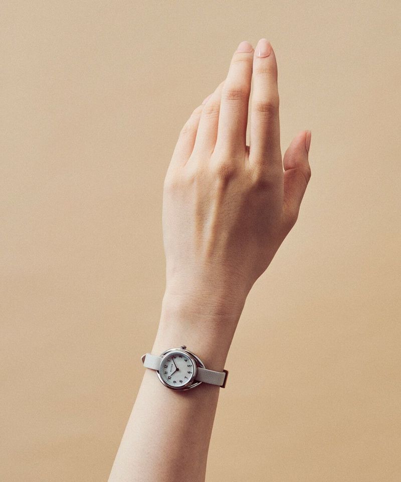 ベルトは柔らかめのカーフレザーで、最初から手首に負担なく馴染む質感だ。細身の8mm幅と小型ケースは、無理なく日常に溶け込むサイズ感で、フォーマルにもカジュアルにも違和感なく寄り添う。この時計を腕に着けると、たとえば白いシャツや軽やかなニットと合わせるときの統一感がぐっと上がる。