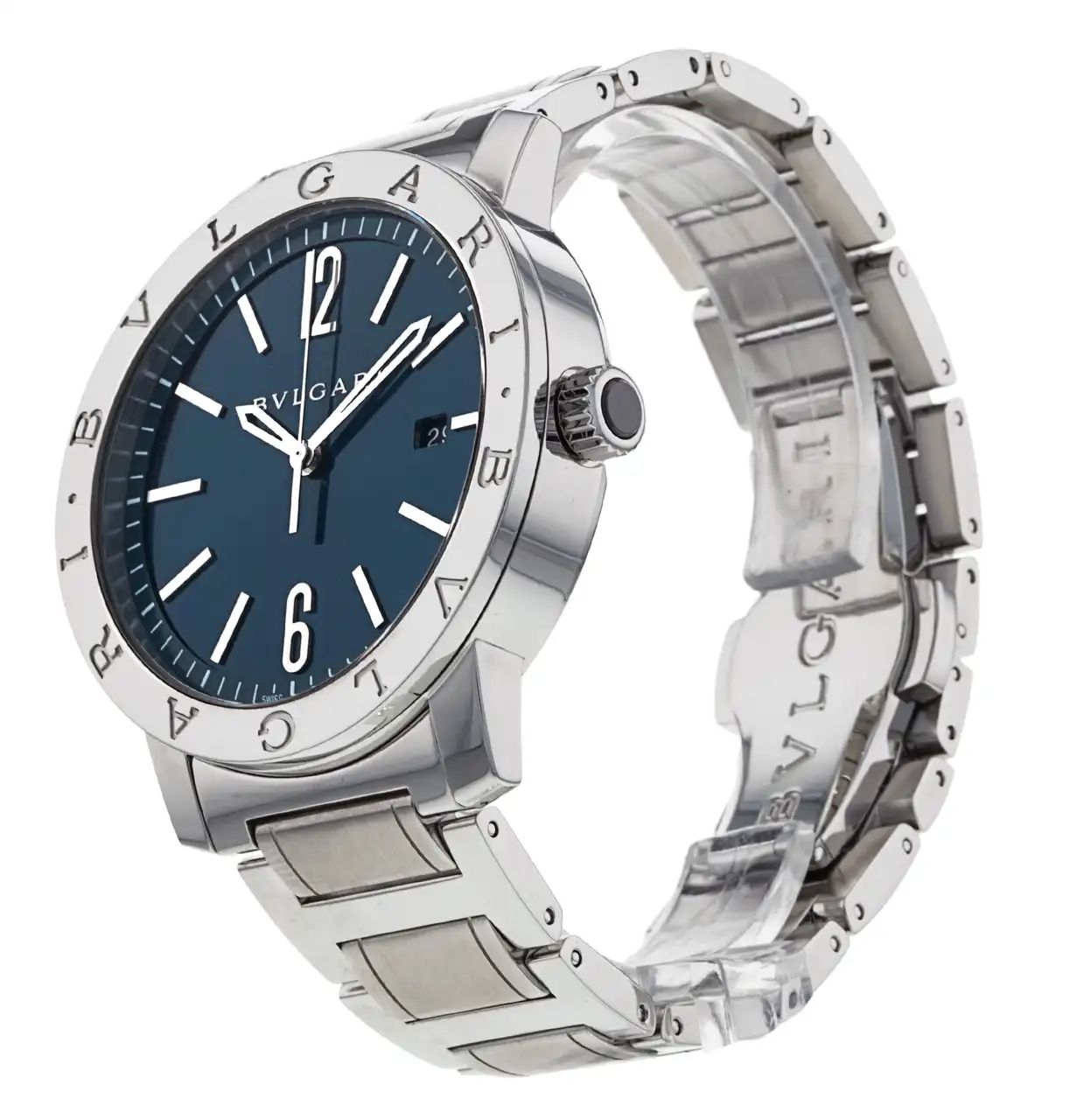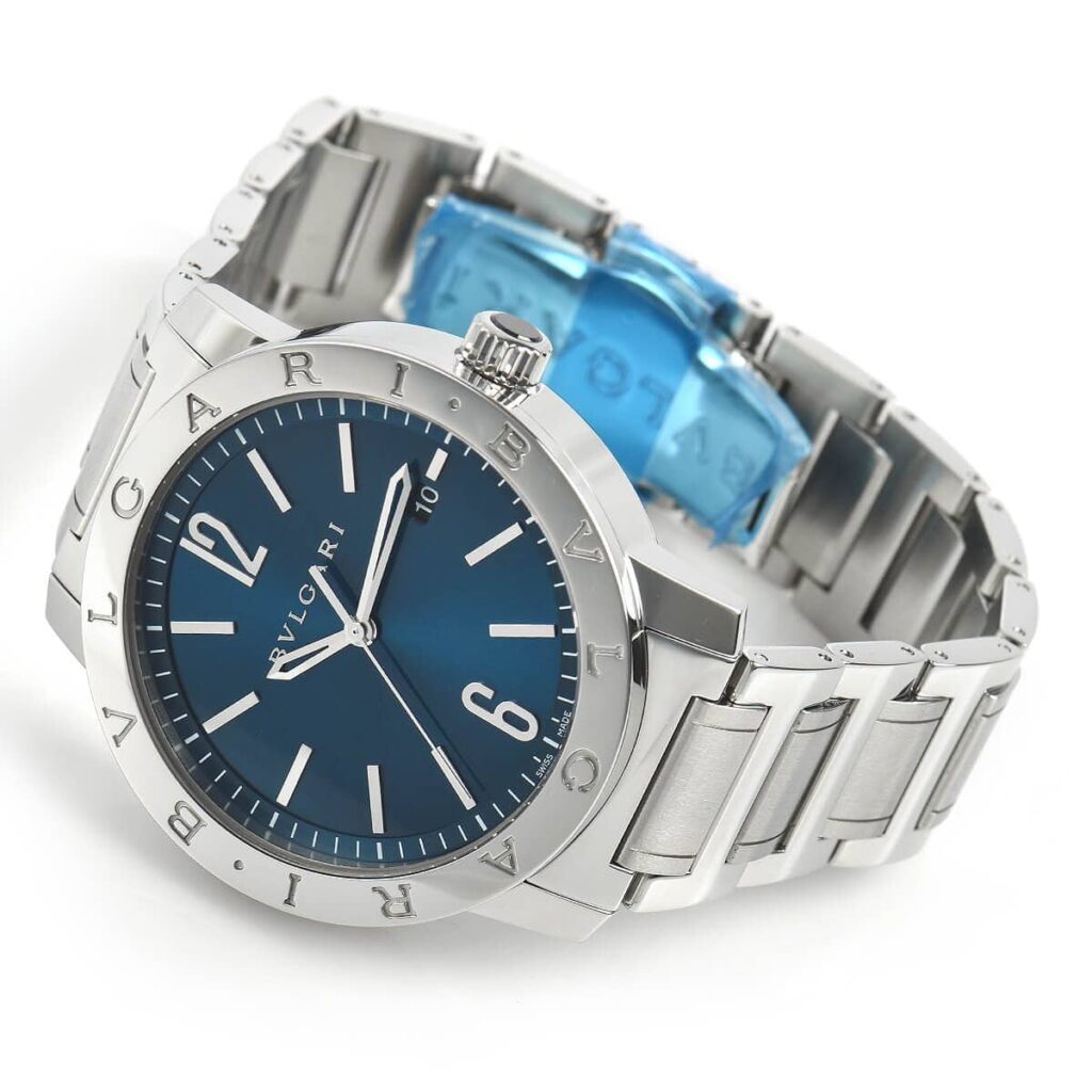 まずこの時計は、ブルガリのアイコニックなシリーズである「Bvlgari Bvlgari」の41mmサイズ・ブルー文字盤モデルであり、ステンレススティール製ケースとブレスレットを採用した自動巻き仕様である。ブルー文字盤はサンレイ仕上げが施され、光の当たり具合で色味に深みが出るのが特徴である。ムーブメントは自社キャリバー搭載で、約50時間のパワーリザーブと日常防水程度の耐水性を備える。裏蓋はシースルーで内部の仕上げを見ることができる点も所有する満足感を高めてくれる。
