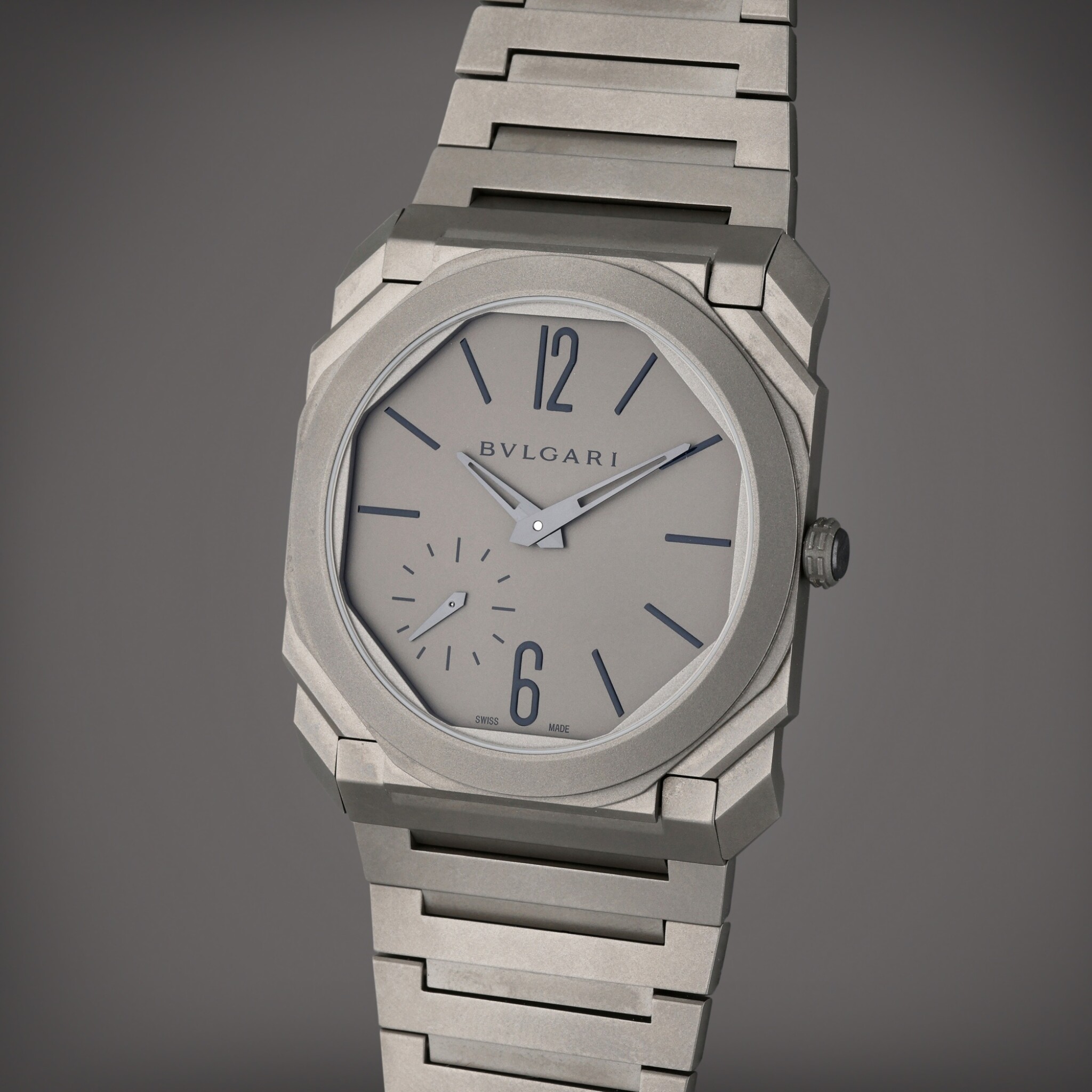 文字盤はグレーで統一されており、その色調の落ち着きと質感は派手さを抑えつつ洗練された都会的な印象を与える。八角形のケースデザインはブルガリ特有の象徴的なモチーフであり、単なる幾何学的形状ではなく、古代ローマ建築の精神性を現代的な時計へと再解釈したものだと理解している。310 年頃に建てられたマクセンティウスのバシリカからインスピレーションを得たとされる八角形は、正面から見るだけでなく、斜めから光を受ける角度によって陰影が織りなす表情も変化し、飽きのこないデザインである。