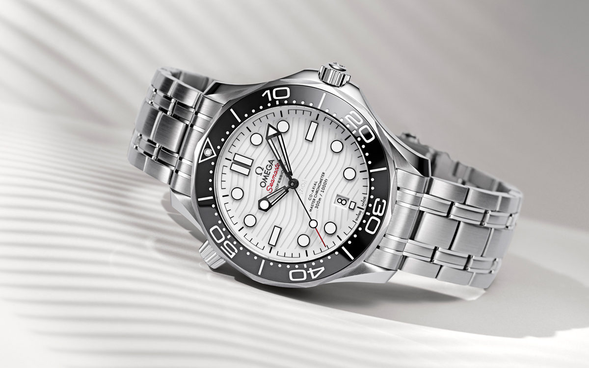 現代のシーマスターの基準であるモデル。300メートル防水、セラミックベゼル、ねじ込みリューズを備え、映画『007』で有名になった。